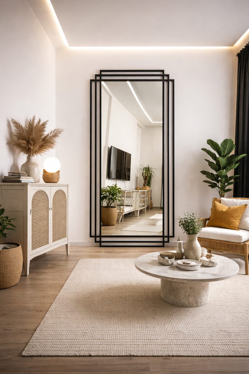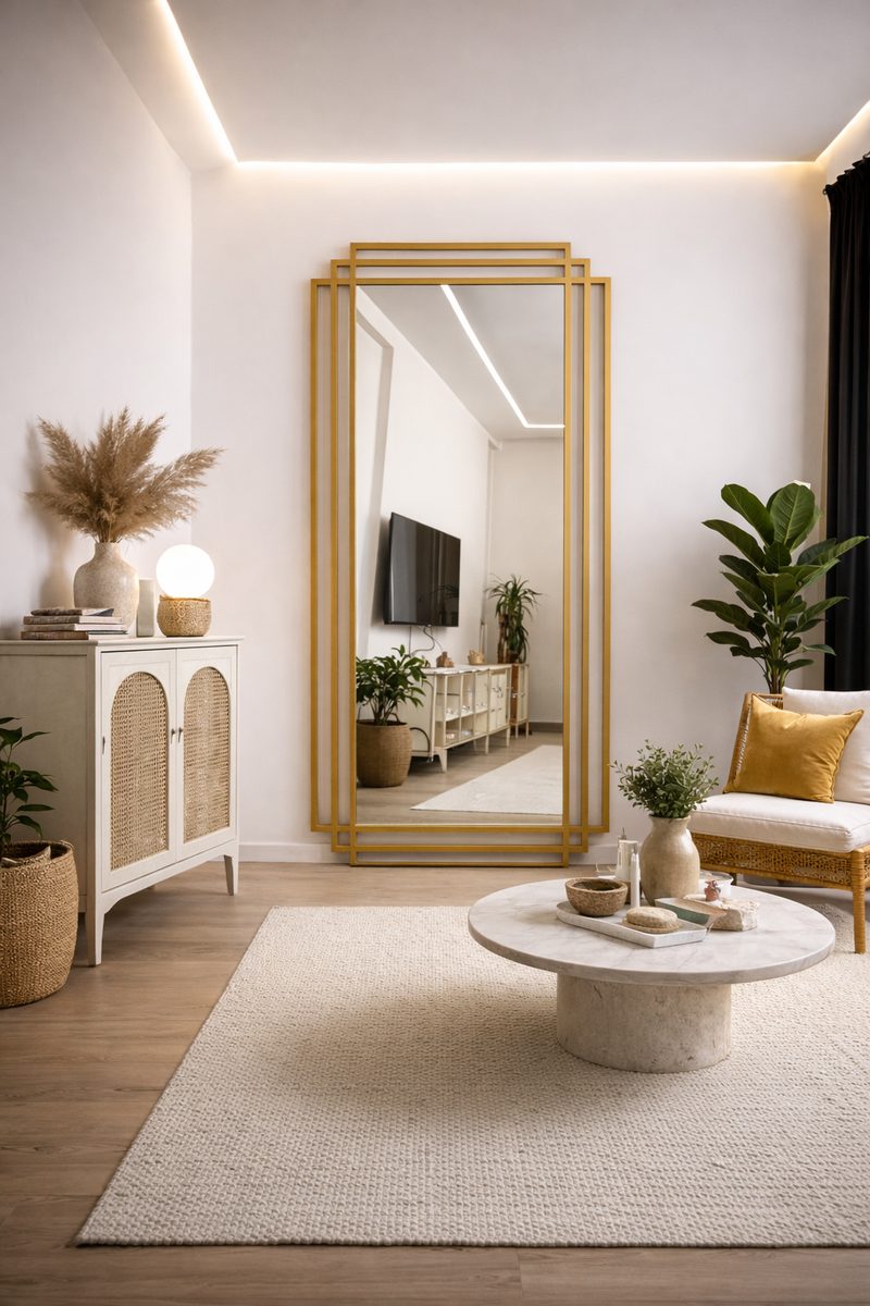 Moderner Ganzkörperspiegel im 3-Bar-Design. Hochwertige, verzerrungsfreie Spiegelfläche. Verfügbar in Schwarz, Gold, Weiß und Vintage.