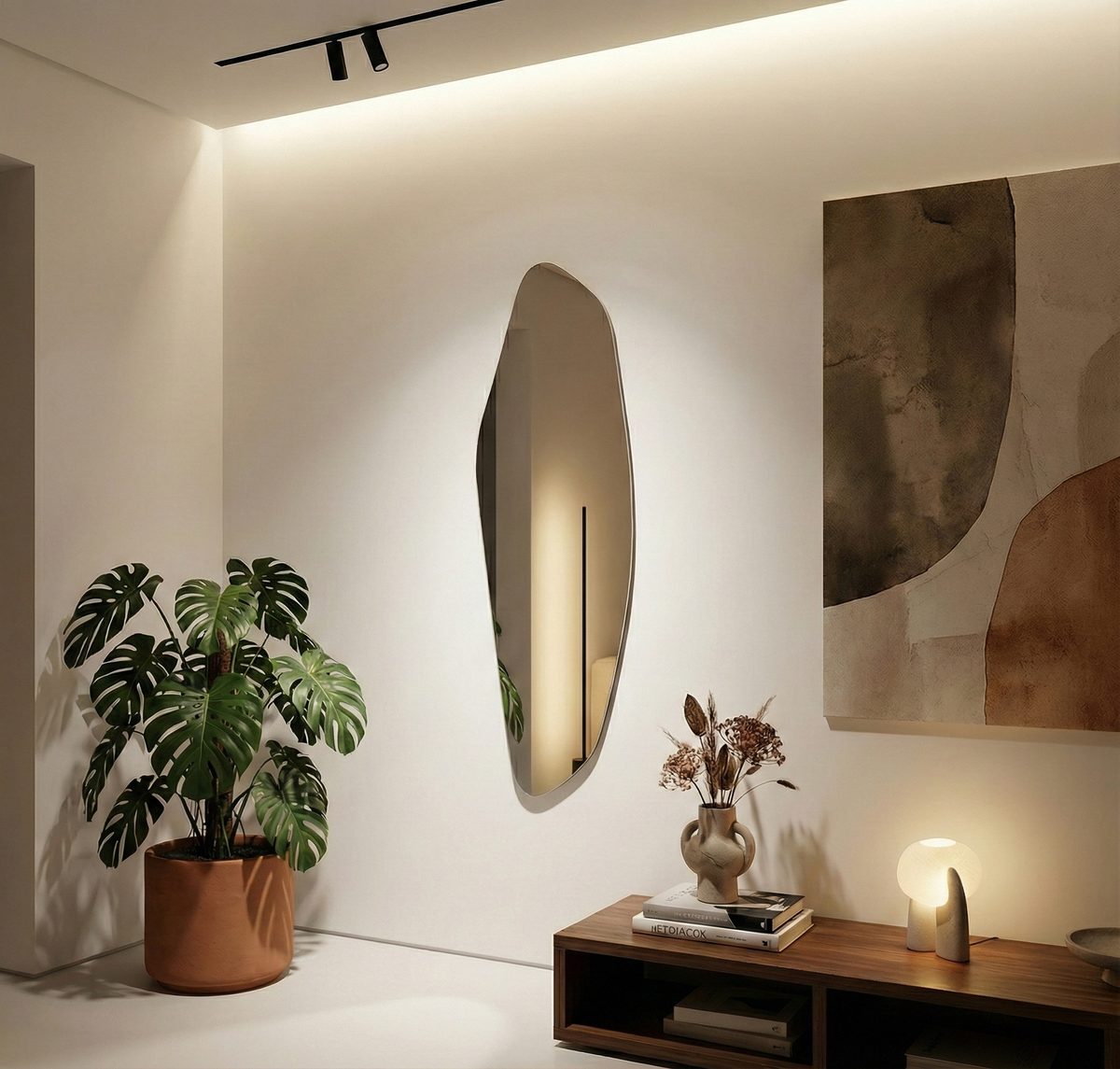 Moderner asymmetrischer Spiegel mit organischer Form und hochwertiger Spiegelfläche.
