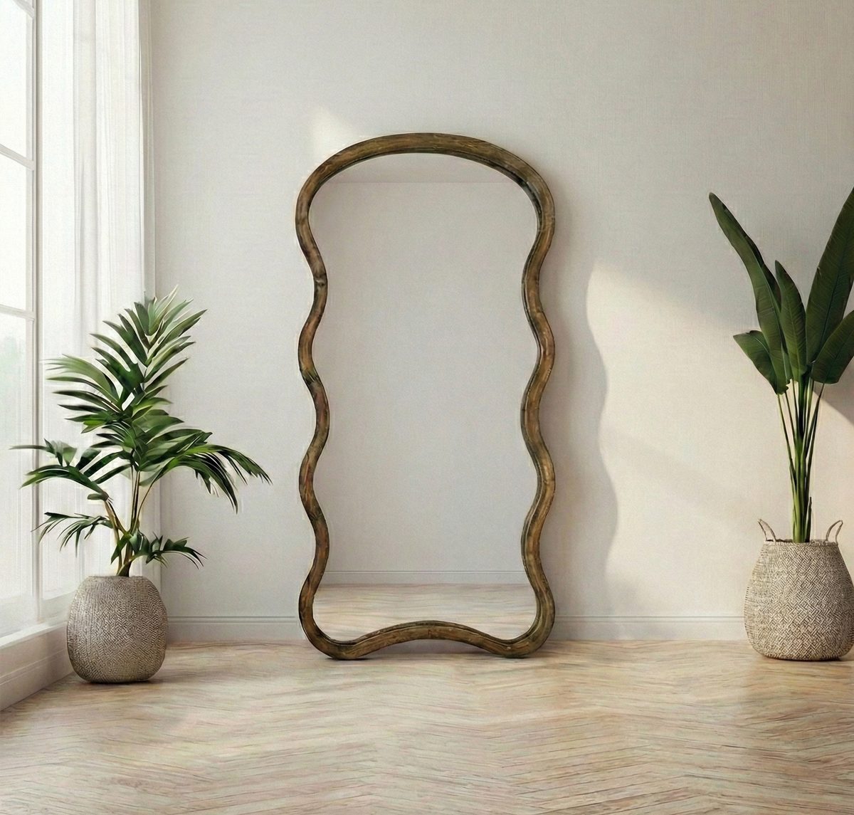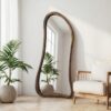 Wolkenförmiger Design-Wandspiegel in 180×80 cm. Wähle zwischen Naturholz oder edlem Walnussholz-Look – stilvoll für Flur, Schlafzimmer oder Wohnzimmer.